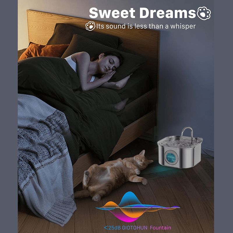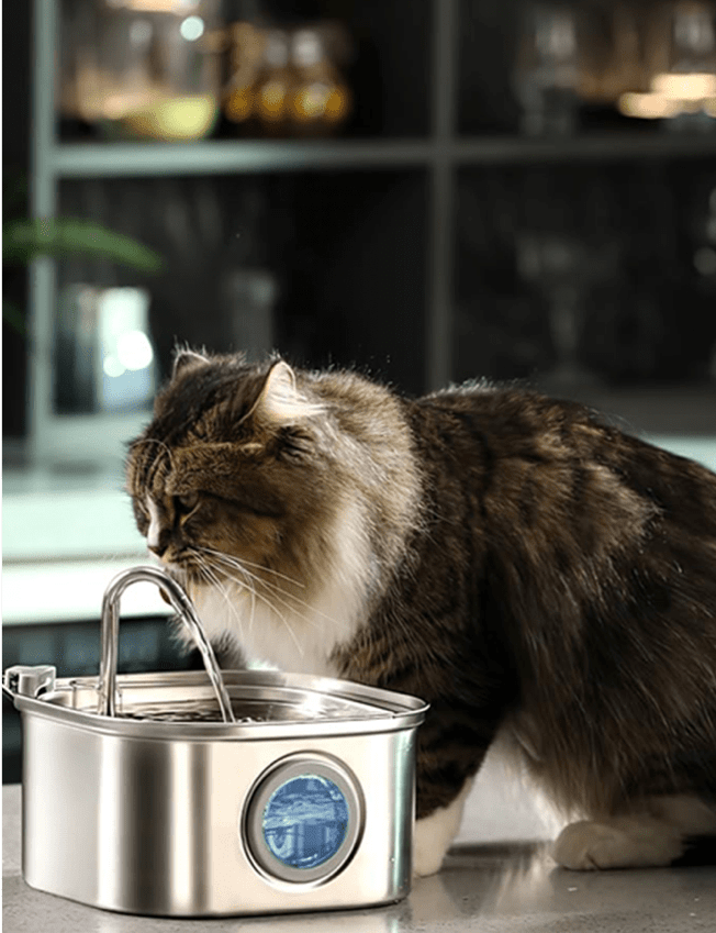 Explains that water fountains have been recommended to increase water intake and summarizes research comparing bowl vs. fountain water sources.